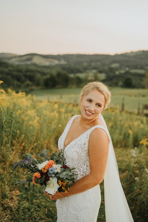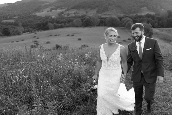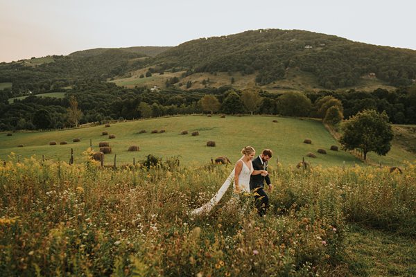 Of course, there is also that gorgeous white barn perched perfectly atop the mountain. It opens on both sides to allow a lovely flow of mountain air throughout the reception area. I just love how Becca and John chose to decorate it with wildflowers and vines of greenery going up the pillars.